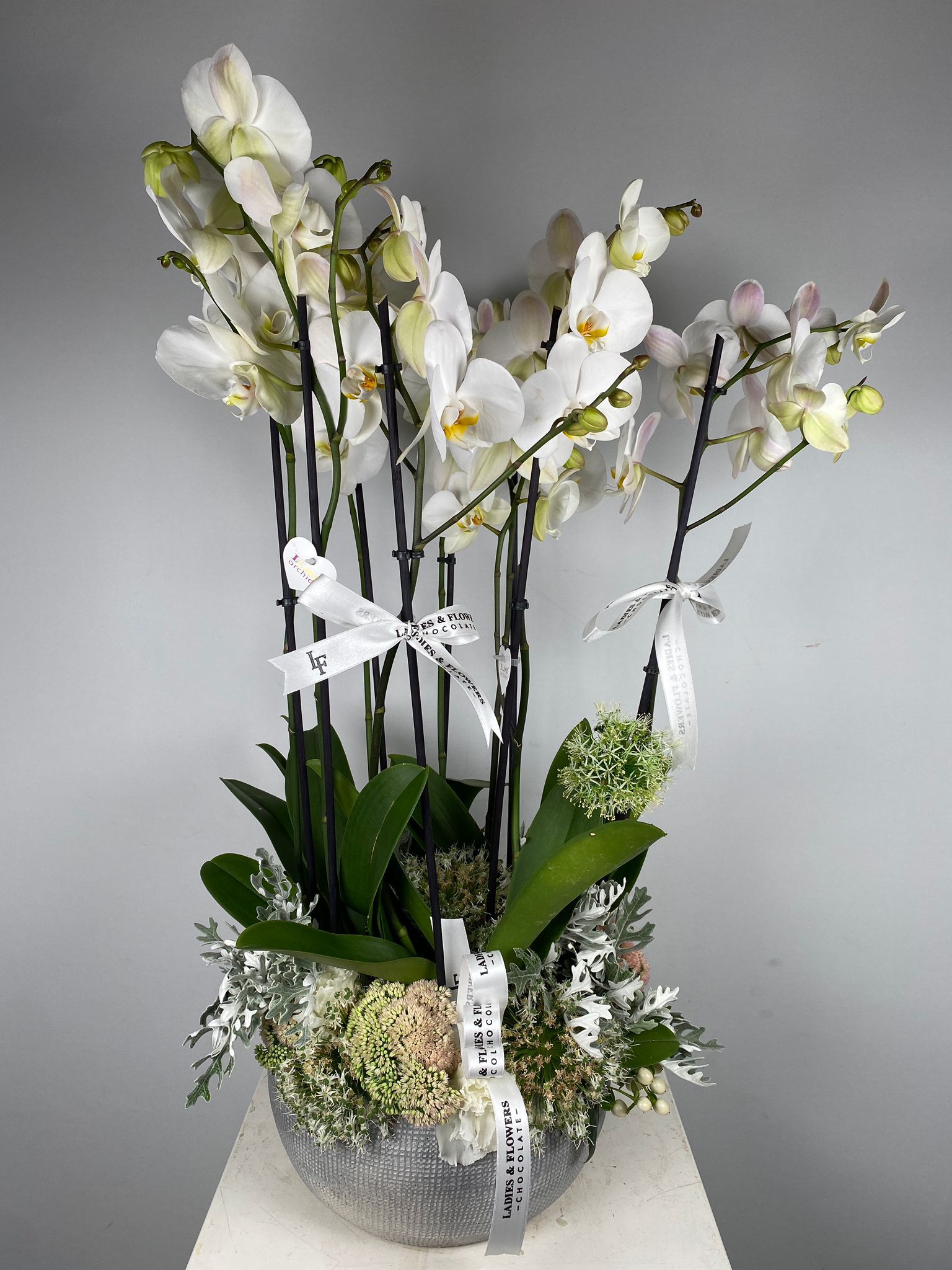 Orkide-ortanca-lisyantus-anastasya kullanılmıştır. Lüks kağıt kullanılmıştır. Sizler için özenle mevsiminin en şık ve taze çiçeklerini seçip sizlerle buluşturuyoruz. Kullanmış olduğumuz ürünler