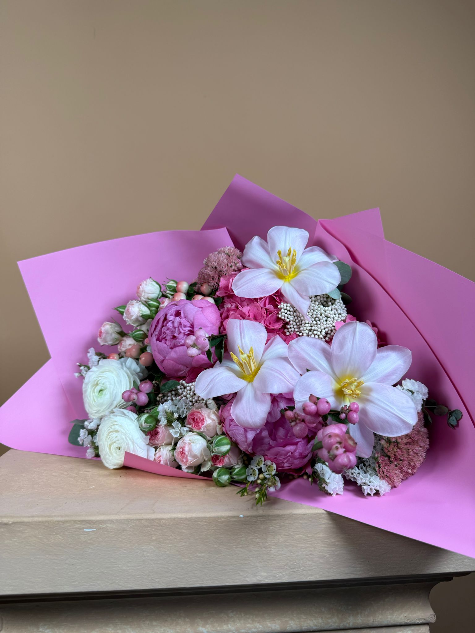 Anastasya-delfıum-krizantem-tulipa kullanılmıştır. Lüks kağıt kullanılmıştır. Sizler için özenle mevsiminin en şık ve taze çiçeklerini seçip sizlerle buluşturuyoruz. Kullanmış olduğumuz ürünler