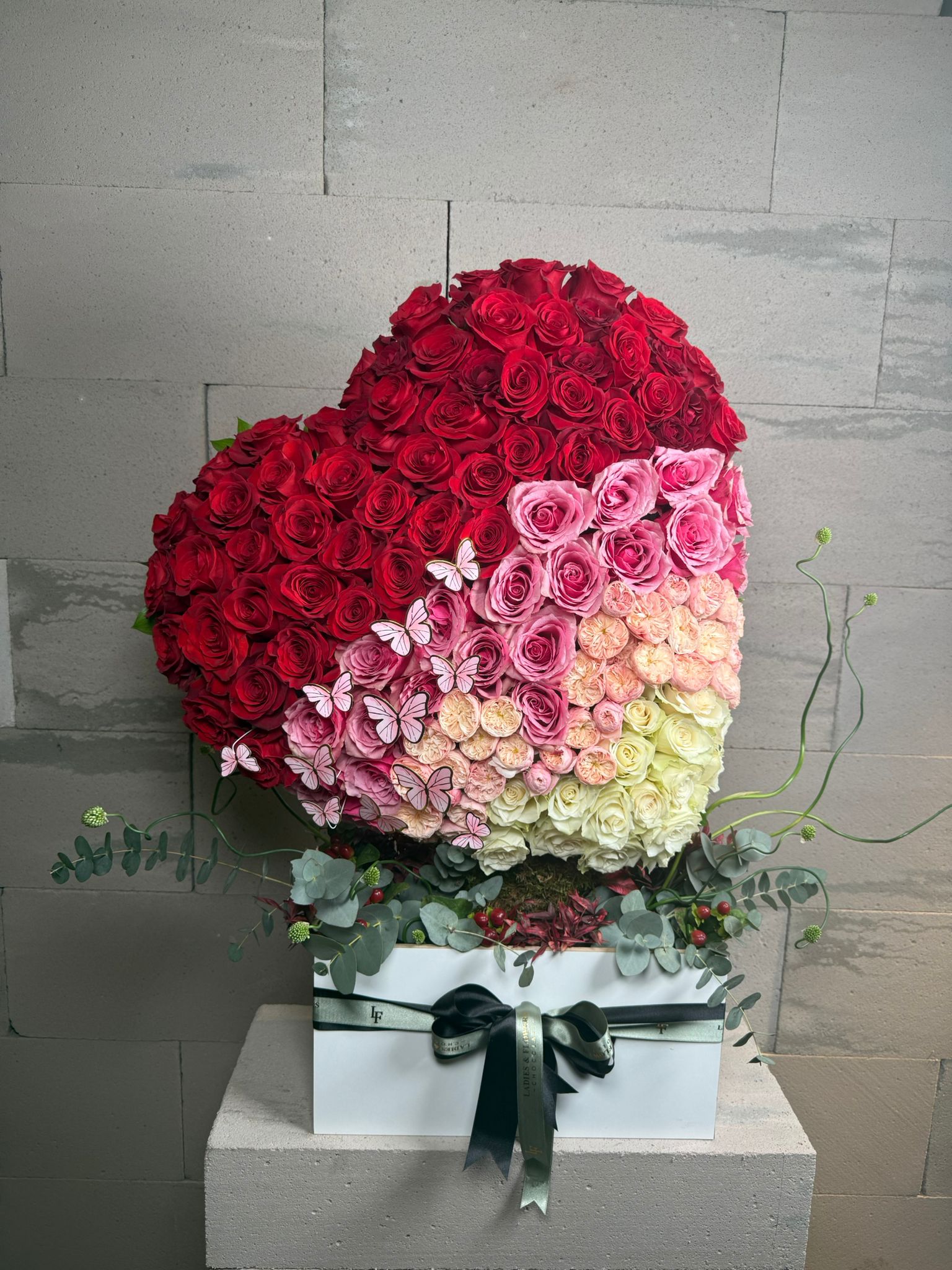 Kırmızının en derin tonlarından beyazın saflığına uzanan bu eşsiz renk geçişi, bir kalbin tüm heyecanlarını temsil ediyor. Üzerindeki zarif kelebek dokunuşlarıyla Papilio Amoris, sıradan bir çiçek aranjmanından çok daha fazlası; o bir aşk hikayesi.