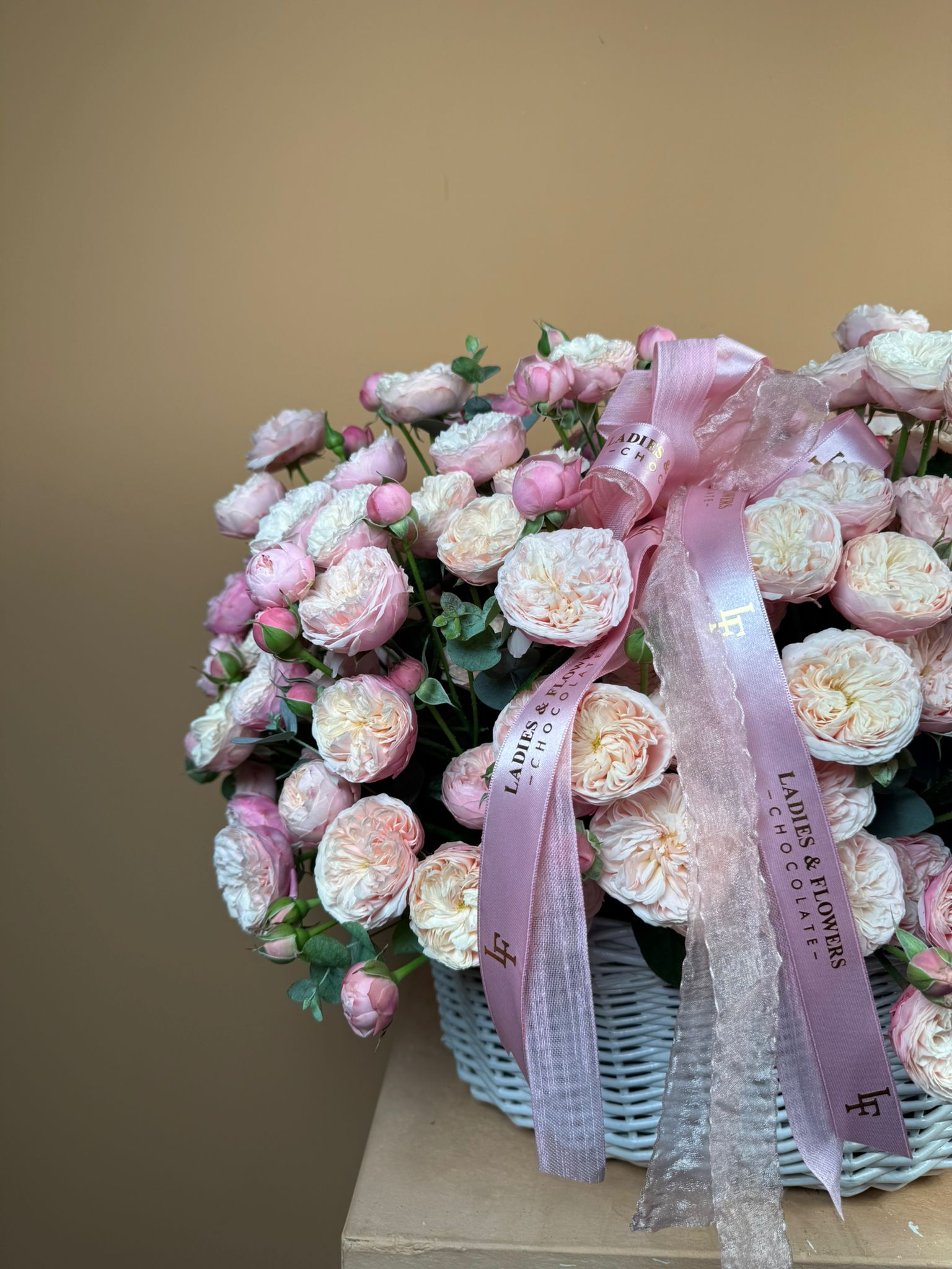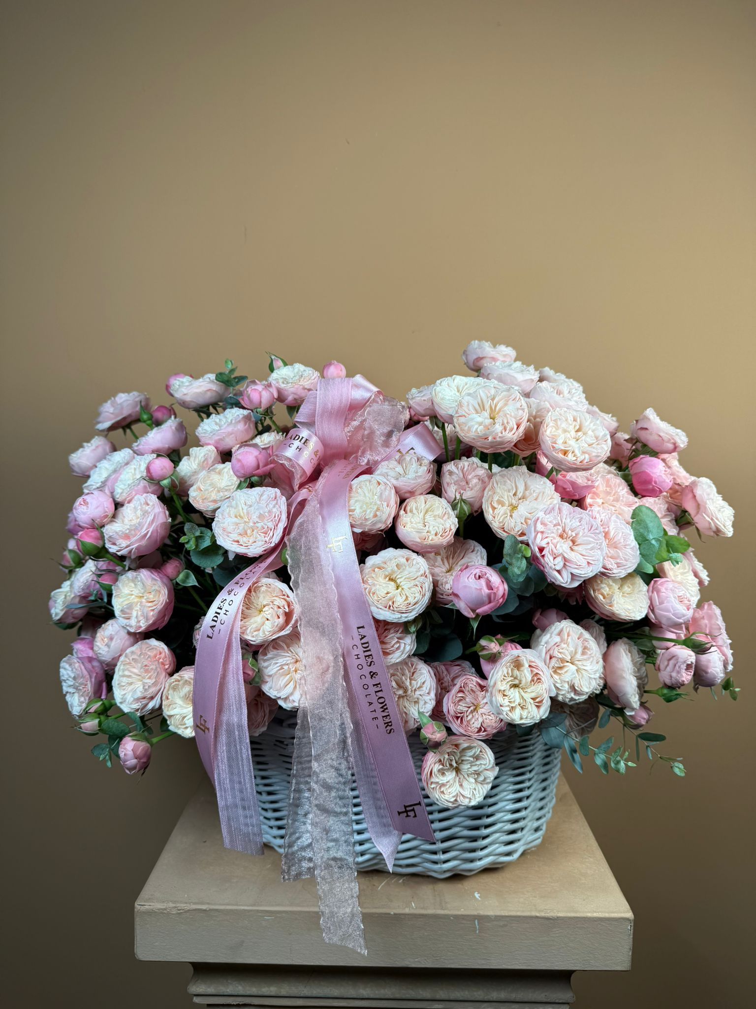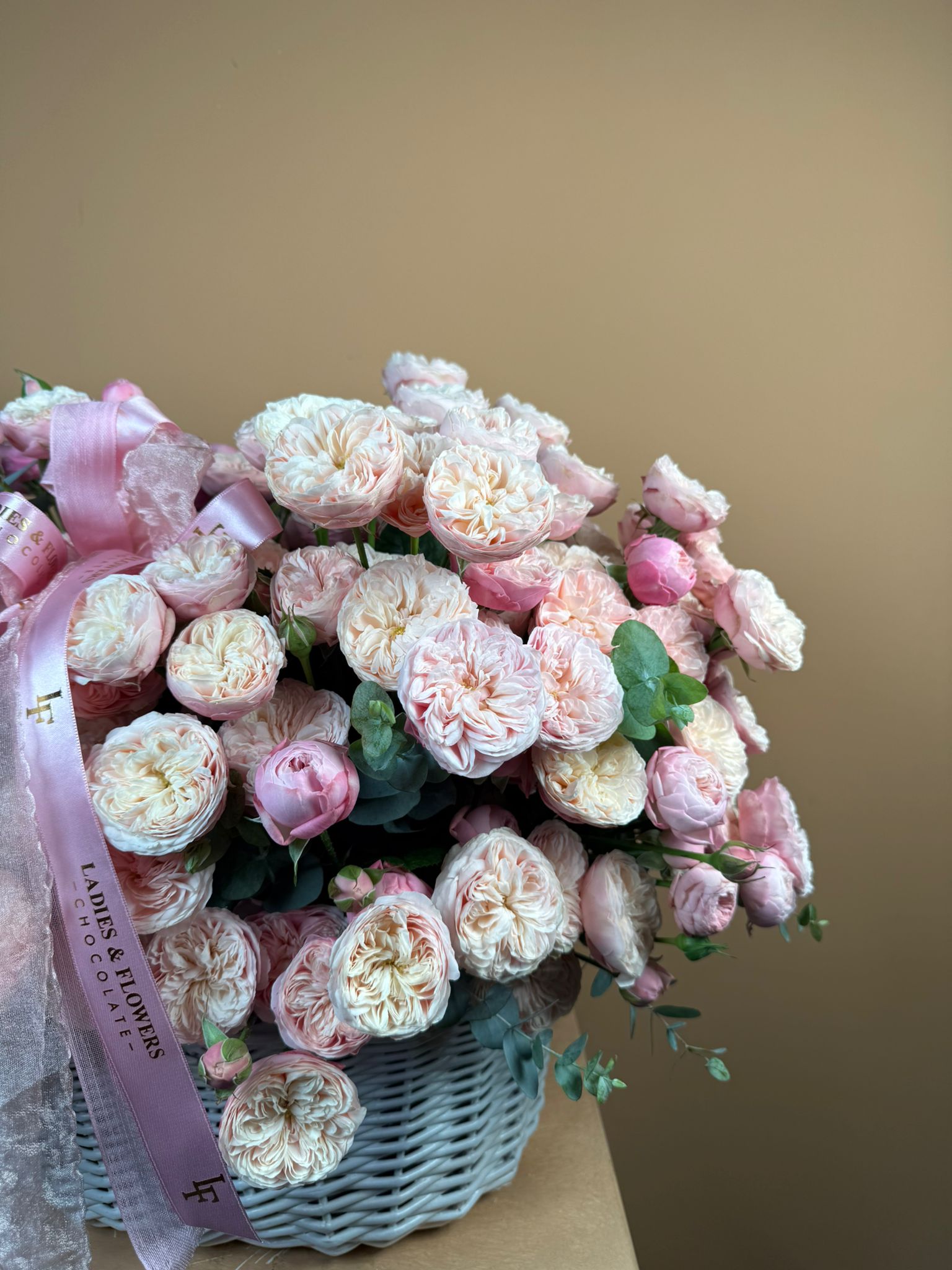Soft pembe tonlara sahip İngiliz gülleri, özenle seçilmiş yeşillikler ve şık sepet tasarımıyla hazırlanan bu özel aranjman; sevginizi, şefkatinizi ve inceliğinizi en zarif haliyle ifade eder.