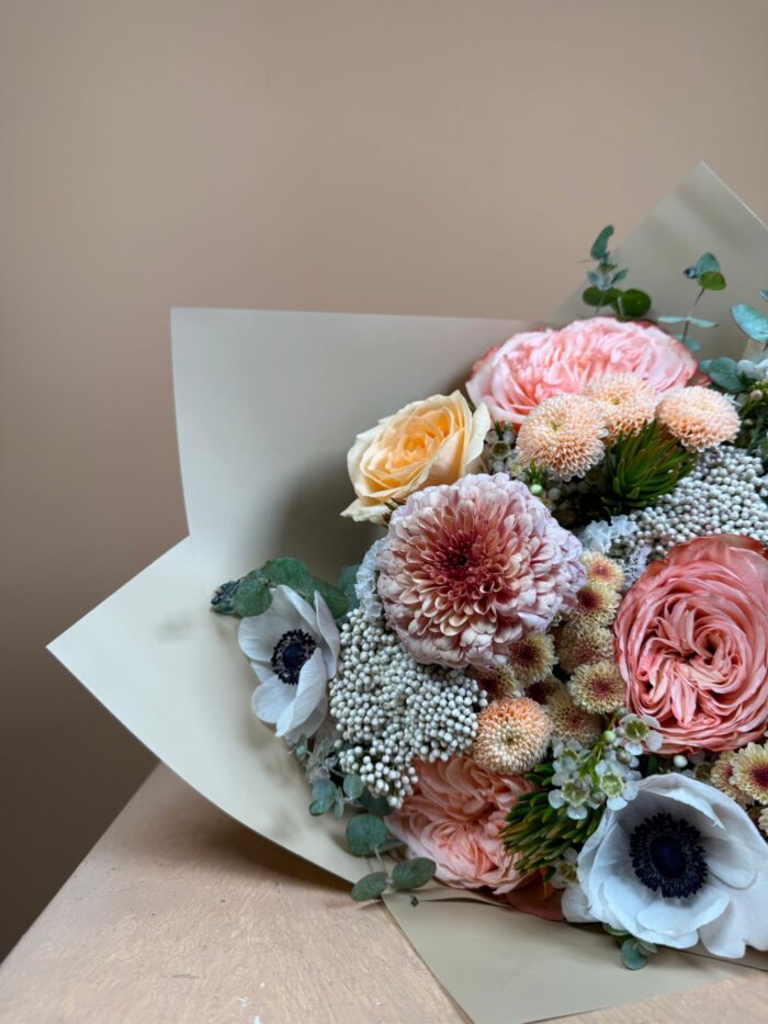 Ortanca ve peony (şakayık) kullanılmıştır. Lüks kağıt kullanılmıştır. Sizler için özenle mevsiminin en şık ve taze çiçeklerini seçip sizlerle buluşturuyoruz.